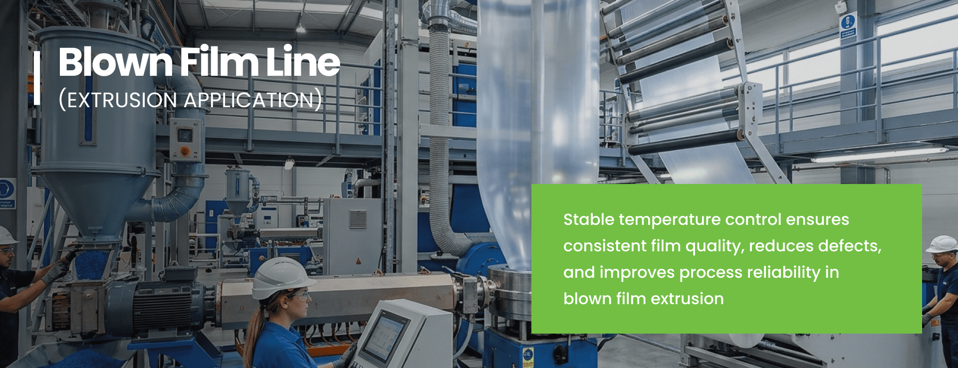 The GIC TCS4U5A0 PID temperature controller enhances blown film extrusion by combining precise temperature control with CT-based current monitoring. This results in improved film quality, reduced defects, early fault detection, and higher production reliability—delivering significant operational and maintenance benefits.