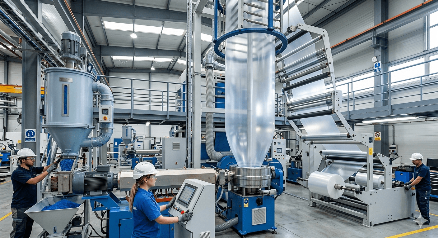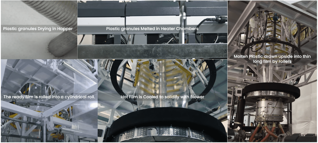 A modern blown film extrusion line consists of an extruder, circular die, air ring cooling system, bubble formation zone, nip rollers, and winding unit. Polymer granules (LDPE/HDPE) are melted in a multi-zone heated barrel (typically ~160–200 °C), then extruded through a die to form a tubular bubble. The bubble is inflated and cooled by air, forming a thin film which solidifies and is wound continuously. Precise temperature control across barrel and die zones is critical for stable melt flow and consistent film quality.Shape